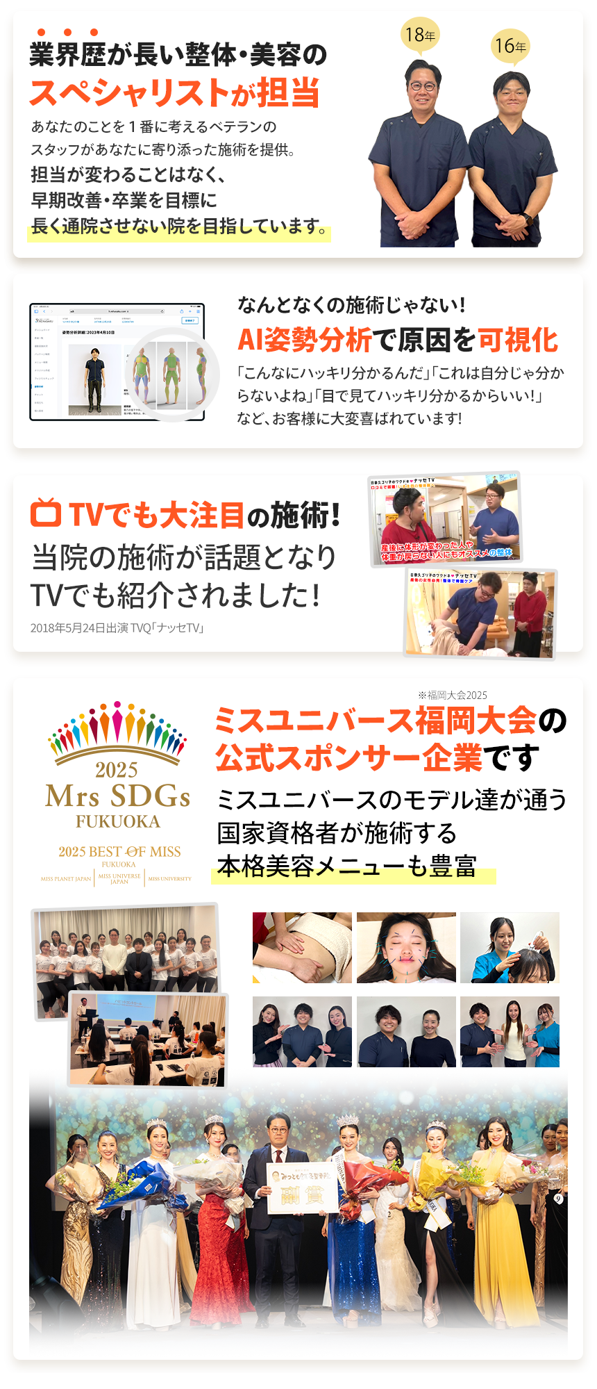 産後の骨盤矯正、交通事故むち打ち治療、頭痛、肩こり、腰痛、ヘルニア、猫背、五十肩、生理痛、マタニティなど各症状の専門スタッフが在籍していますのでなんでもご相談ください。患者様の身体が良くなるまで担当スタッフがしっかり診ていきます。