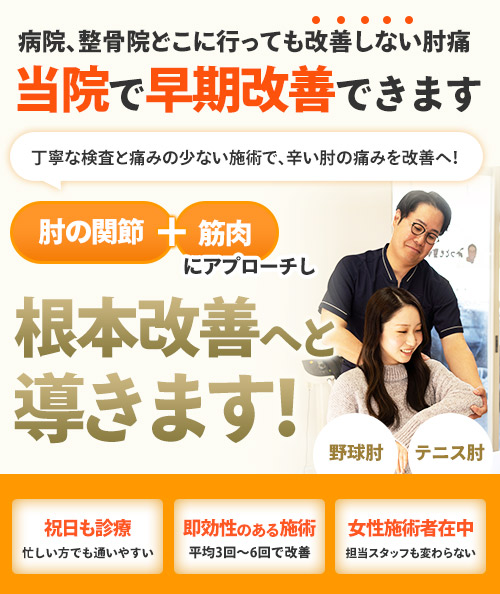 一般的に肩こりや腰痛などの患者さんに矯正を行い、背骨・骨盤を正しい位置に戻すことで負担が軽くなり痛みを改善してくやり方ですが、肘に対しても同じように矯正することで負担を取り除きます。