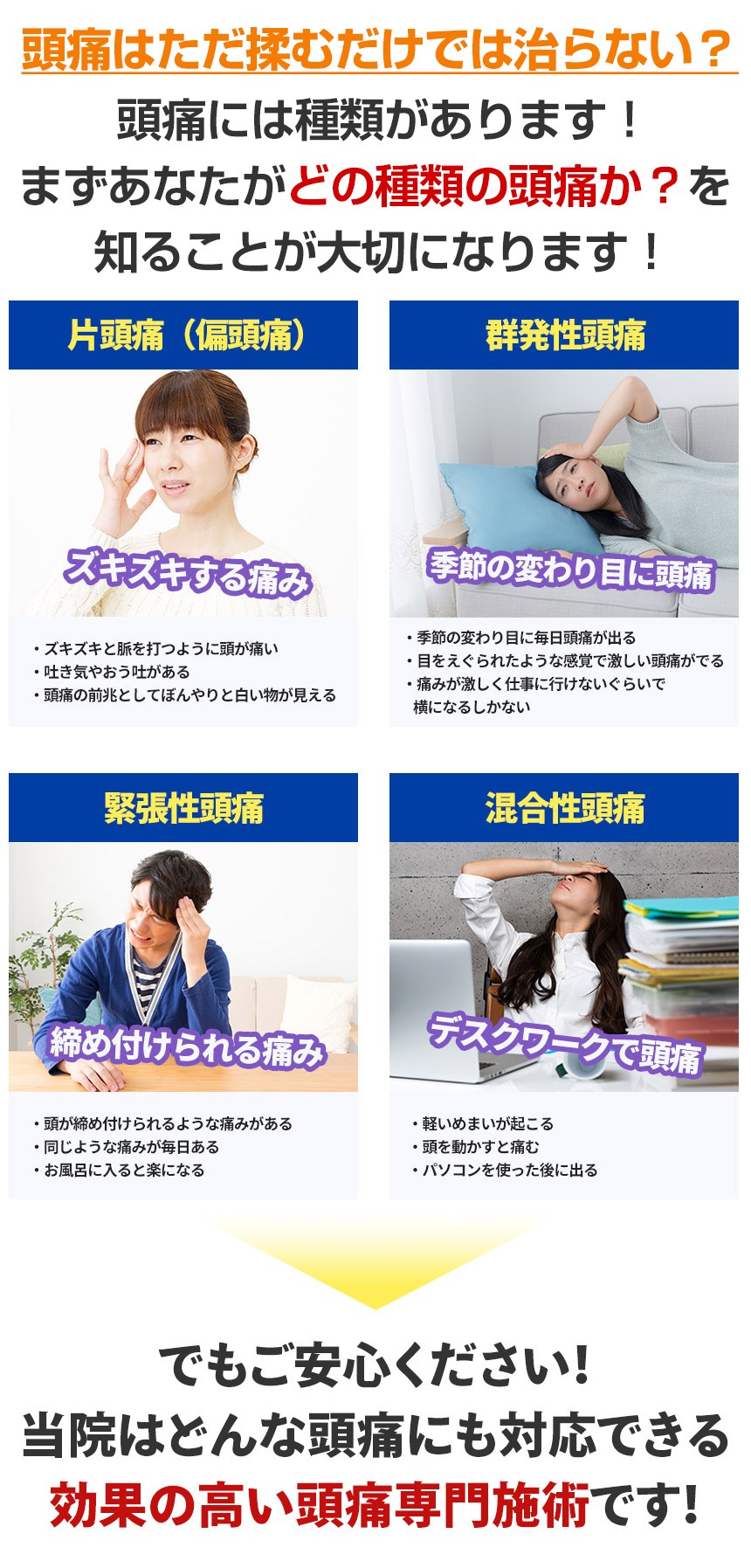 上記に当てはまる方で当院に来院された患者様のお話を聞くと、頭痛が発症してから2年間から3年間苦しんでいる方たちばかりです!